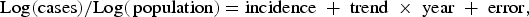 $${\rm Log(cases)}/{\rm Log(\,population)} = {\rm incidence}\; + \; {\rm trend\;} \times \; {\rm year}\; + \; {\rm error,}$$