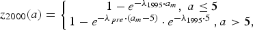 $$z_{1995}(a) = 1 - e^{ - \lambda _{{\rm pre}} \cdot a_m},$$ $$z_{2000}(a) = \left\{ {\matrix{ {1 - e^{ - \lambda _{1995} \cdot a_m},\; a \le 5} \cr {1 - e^{ - \lambda _{\,pre} \cdot (a_m - 5)} \cdot e^{ - \lambda _{1995} \cdot 5\;}, a \gt 5,} \cr}} \right.$$