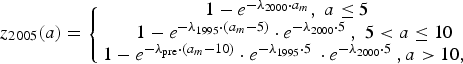 $$z_{2000}(a) = \left\{ {\matrix{ {1 - e^{ - \lambda _{1995} \cdot a_m},\; a \le 5} \cr {1 - e^{ - \lambda _{\,pre} \cdot (a_m - 5)} \cdot e^{ - \lambda _{1995} \cdot 5\;}, a \gt 5,} \cr}} \right.$$ $$z_{2005}(a) = \left\{ {\matrix{ {1 - e^{ - \lambda _{2000} \cdot a_m}, \; a \le 5\; \; \;} \cr {1 - e^{ - \lambda _{1995} \cdot \left( {a_m - 5} \right)} \cdot e^{ - \lambda _{2000} \cdot 5\;}, \; 5 \lt a \le 10} \cr {1 - e^{ - \lambda _{{\rm pre}} \cdot \left( {a_m - 10} \right)} \cdot e^{ - \lambda _{1995} \cdot 5\;} \cdot e^{ - \lambda _{2000} \cdot 5\;}, a \gt 10,\; \; \; \;} \cr}} \right.$$