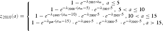 $$z_{2005}(a) = \left\{ {\matrix{ {1 - e^{ - \lambda _{2000} \cdot a_m}, \; a \le 5\; \; \;} \cr {1 - e^{ - \lambda _{1995} \cdot \left( {a_m - 5} \right)} \cdot e^{ - \lambda _{2000} \cdot 5\;}, \; 5 \lt a \le 10} \cr {1 - e^{ - \lambda _{{\rm pre}} \cdot \left( {a_m - 10} \right)} \cdot e^{ - \lambda _{1995} \cdot 5\;} \cdot e^{ - \lambda _{2000} \cdot 5\;}, a \gt 10,\; \; \; \;} \cr}} \right.$$ $$z_{2010}(a) = \left\{ {\matrix{ {1 - e^{ - \lambda _{2005} \cdot a_m}, \; a \le 5\; \; \;} \cr {1 - e^{ - \lambda _{2000} \cdot \left( {a_m - 5} \right)} \cdot e^{ - \lambda _{2005} \cdot 5\;}, \; 5 \lt a \le 10} \cr {1 - e^{ - \lambda _{1995} \cdot \left( {a_m - 10} \right)} \cdot e^{ - \lambda _{2000} \cdot 5\;} \cdot e^{ - \lambda _{2005} \cdot 5\;}, 10 \lt a \le 15\; \;} \cr {1 - e^{ - \lambda _{{\rm pre}} \cdot \left( {a_m - 15} \right)} \cdot e^{ - \lambda _{1995} \cdot 5\;} \cdot e^{ - \lambda _{2000} \cdot 5\;} \cdot e^{ - \lambda _{2005} \cdot 5\;}, a \gt 15,} \cr \; \cr}} \right.$$