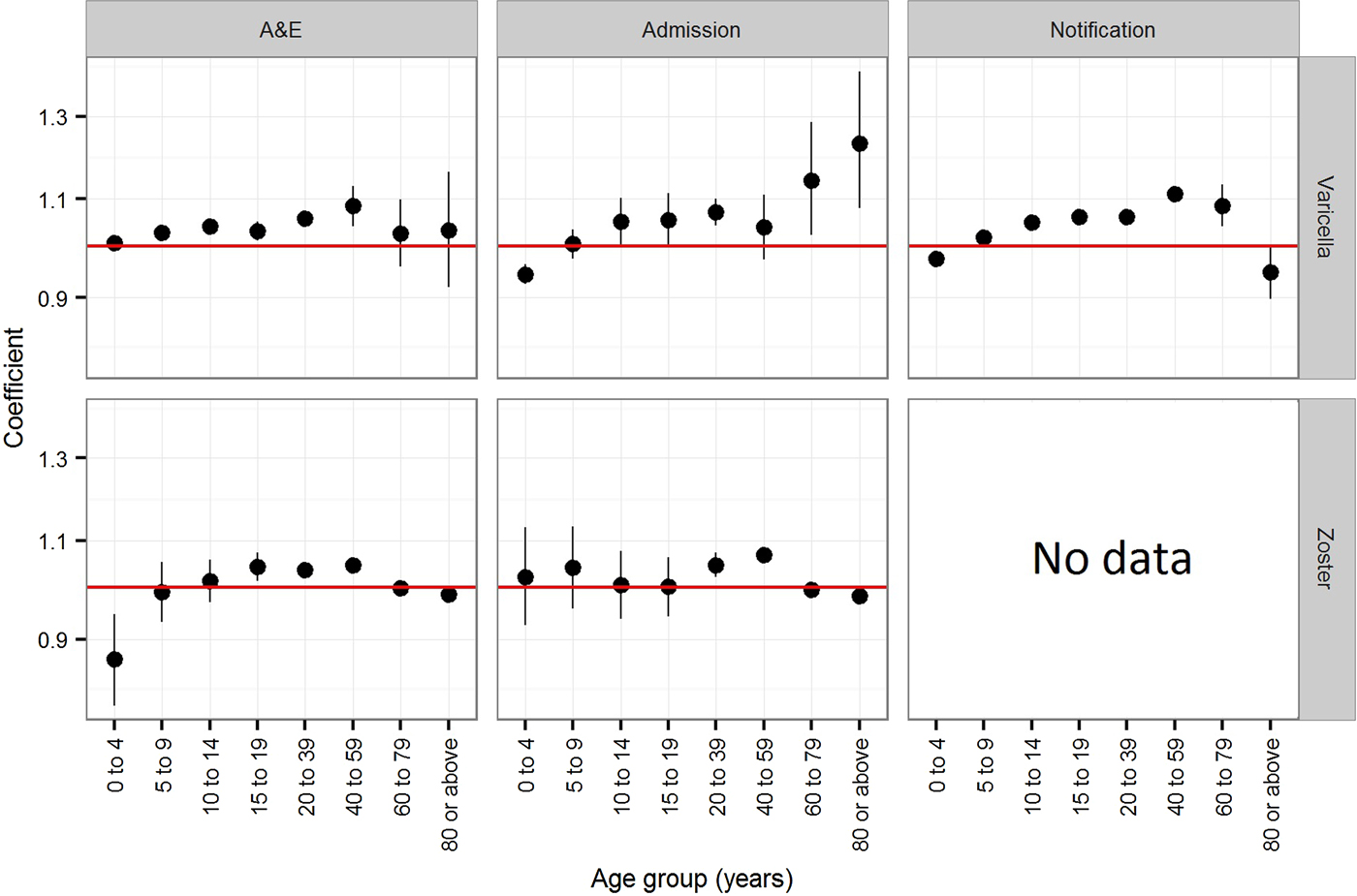 Fig. 3. Coefficients (trends) of the Poisson regression on the annual rate of varicella notification, varicella and zoster A&E attendance and hospitalsations in Hong Kong. Notification is available only for varicella. A coefficient of zero indicates no change.