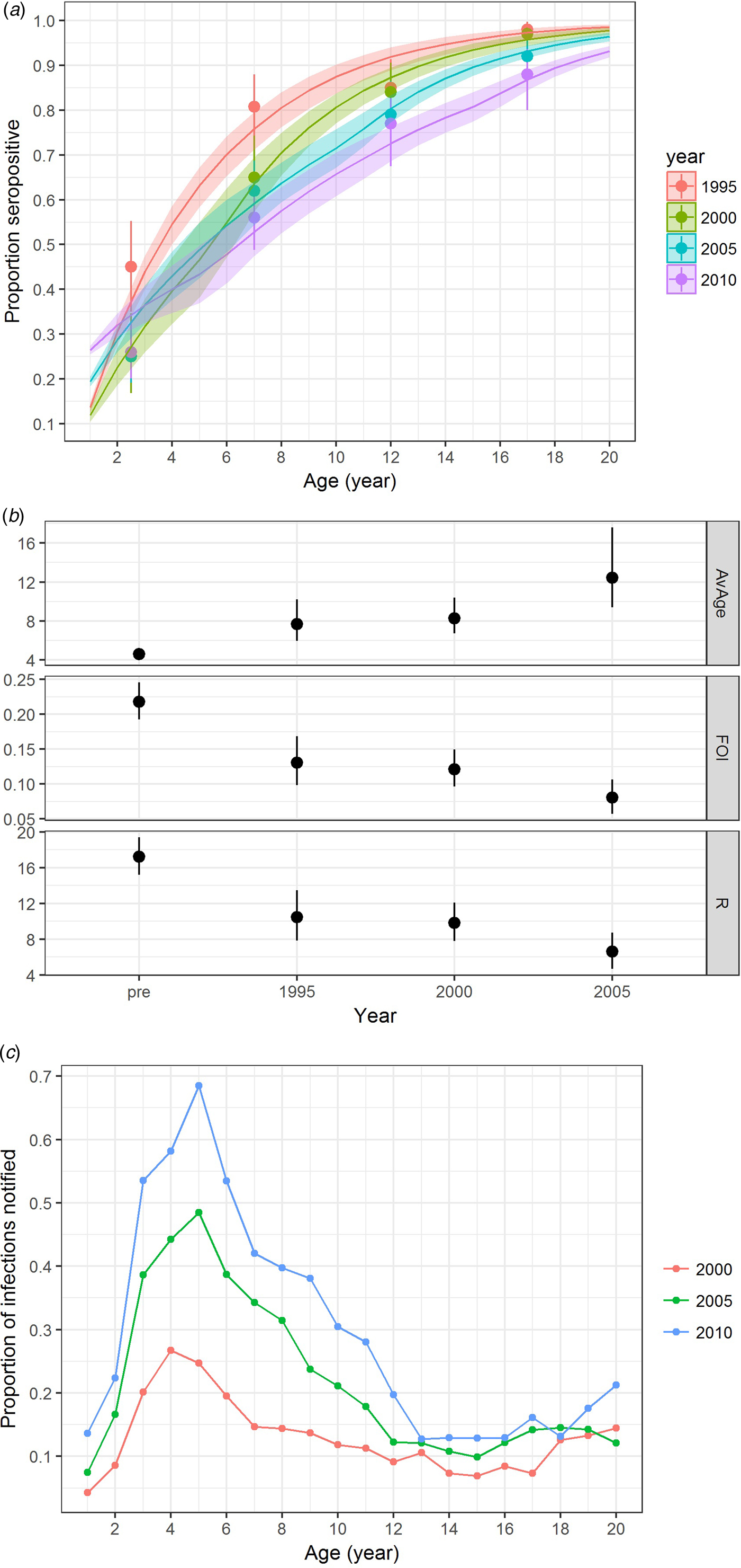 Fig. 4. Varicella serology and estimated transmission parameters in Hong Kong in 1995, 2000, 2005 and 2010. (a) Proportion seropositive against varicella antibody by ELISA test (points with error bars representing 95% CI) and model fitting (line charts with shaded errors bands representing 95% CI), (b) average age of infection [AvAge], annual average force of infection [FOI] and basic reproduction number [R] and (c) reporting ratio between varicella notification and number of infections estimated. Age-specific data on varicella notification are only available for analysis for the year 1999 and onwards.