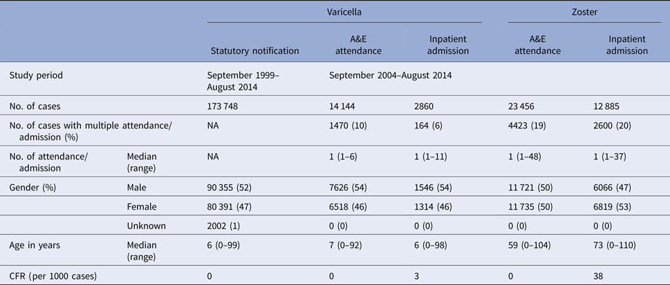 There were no deaths recorded for varicella and zoster A&E attendance. The crude case-fatality rate of varicella notification, varicella and zoster admissions were 0.005, 3.1 and 37.6 deaths per 1000 cases, respectively.