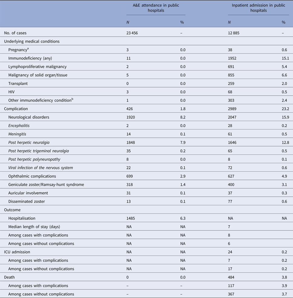 Table 3. Underlying medical conditions, complications and outcomes of zoster-related A&E attendance and inpatient admissions