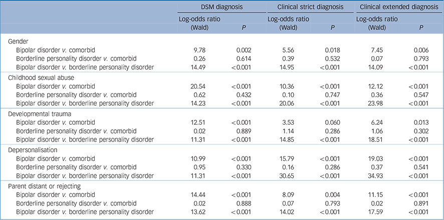 Our log-linear analyses compared members of each of the three groups for those variables identified as most clearly differentiating in univariate analyses. In relation to DSM diagnostic assignment, there was a strikingly consistent pattern in that the bipolar disorder group differed significantly from the comorbid group on 13 of the 14 variables examined, the bipolar disorder group differed from the borderline personality disorder group on 12, and the borderline personality disorder and comorbid groups did not differ – or show any trend for differentiation – on any of the 14 variables. Thus, those with a borderline personality disorder diagnosis – alone or as comorbid with a bipolar disorder diagnosis – were more likely to be women, have experienced childhood sexual abuse and other developmental trauma, report depersonalisation in childhood, been recipients of deficient parenting, return strikingly higher borderline personality measure scores and be more likely to have made a self-harm or suicide attempt. Similar patterns – albeit somewhat less distinctive – were returned in relation to the two other diagnostic strategies. Our finding is in line to some degree with a report by Zimmerman et al Reference Zimmerman, Morgan, Young, Chelminski, Dalrymple and Walsh19 identifying that borderline personality disorder presents similarly in those with a bipolar disorder or a major depressive disorder.