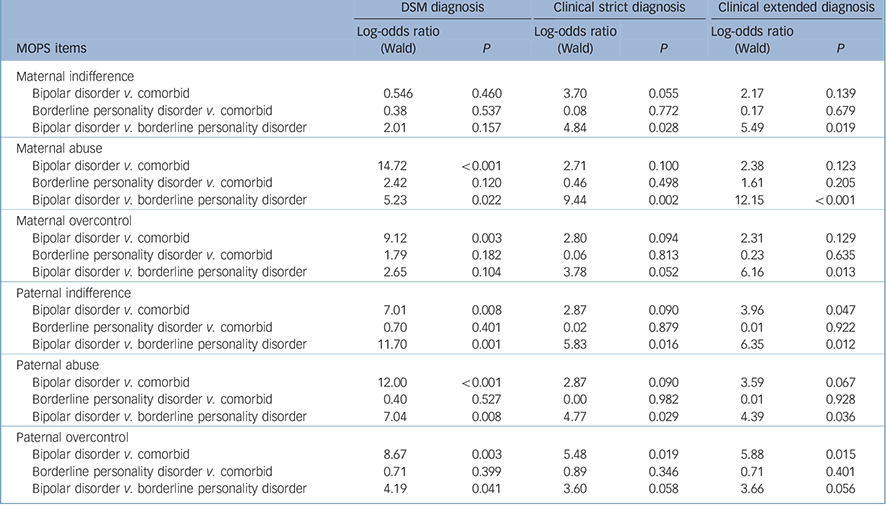 We undertook a series of log-linear analyses examining for differences between paired groups (i.e. bipolar disorder v. comorbid, borderline personality disorder v. comorbid, and bipolar disorder v. borderline personality disorder) for key clinical (apart from illness course) variables and which had shown group differences in our online Table DS1 analyses. Tables 1, 2 and 3 report such analyses (quantified with the Wald statistic) and with the first two columns reporting results in relation to DSM assignment. Across the fourteen variables, a clear and quite striking pattern is evident. The bipolar disorder v. comorbid analyses were all significant at P<0.02, apart from maternal MOPS indifference scores. Similarly, most of the analyses comparing bipolar disorder v. borderline personality disorder groups were significant (P<0.05) apart from those contrasting maternal MOPS indifference and overcontrol scores. Finally, none of the analyses comparing the borderline personality disorder v. comorbid groups were significant, nor did they show any trends for differences. In essence, the borderline personality disorder and comorbid groups were comparable on nearly all principal study variables.