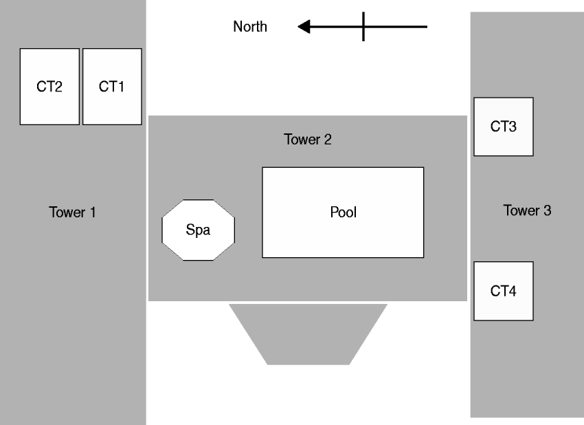 Fig. 1. Aerial view of tower structures and rooftop cooling towers (CT), spa, and swimming pool at a condominium complex in Las Vegas, Nevada, 2001.