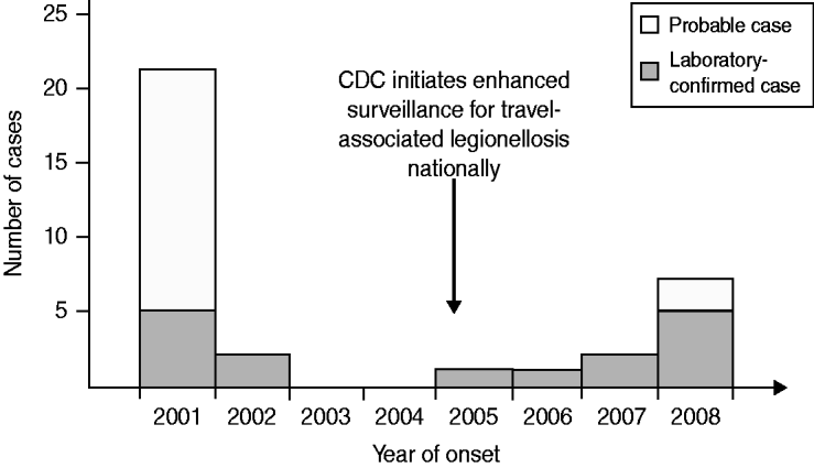 Fig. 2. Number of Legionnaires' disease probable and confirmed cases in travellers to a condominium complex in Las Vegas, Nevada, 2001–2008.