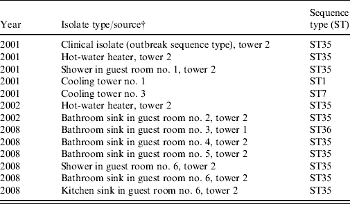 Table 2. Sequence-based typing of selected L. pneumophila serogroup 1 isolates from samples collected at a condominium complex, Las Vegas, Nevada, 2001–2008Footnote *