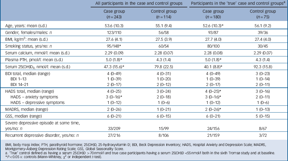 Several population-based studies have investigated the relationship between depression and vitamin D, but with conflicting results. Thus, some cross-sectional studies have found an association between low levels of serum 25-hydroxyvitamin D (25(OH)D) and depressive symptoms, Reference Armstrong, Meenagh, Bickle, Lee, Curran and Finch4–Reference Kjærgaard, Joakimsen and Jorde6 whereas other studies of similar design have found no such associations. Reference Schneider, Weber, Frensch, Stein and Fritze7–Reference Zhao, Ford, Li and Balluz9 Only a few randomised placebo-controlled studies have been reported, and the results from these are also conflicting. Two studies have found a significant effect of high-dose vitamin D supplementation on depressive symptoms, Reference Lansdowne and Provost10,Reference Jorde, Sneve, Figenschau, Svartberg and Waterloo11 whereas no such effect was observed by others Reference Vieth, Kimball, Hu and Walfish12,Reference Sanders, Stuart, Williamson, Jacka, Dodd and Nicholson13 but methods, including vitamin D administration, varied greatly between the studies. Accordingly, further studies are needed to establish whether there is a causal relation between vitamin D status and symptoms of depression. Such a relationship would presumably be most easy to demonstrate in participants with low serum 25(OH)D levels. We have recently measured serum 25(OH)D levels in close to 13 000 participants in the sixth Tromsø study; from all these participants suitable individuals were invited to take part in a cross-sectional as well as an intervention study regarding depressive symptoms, based on their vitamin D status. The study was registered at ClinicalTrials.gov (NCT00960232).