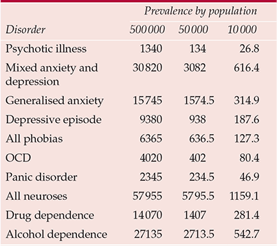 Findings of the survey of psychiatric morbidity among adults living in private households in Great Britain (Office for National Statistics, 2001) allow an estimation of the number of people with depression or anxiety likely to occur in a specific population. As an example, Table 1 shows the likely numbers in populations of 500 000 – the new primary care trust (PCT) average population, 50 000 – the average population for a community mental health team (CMHT), and 10 000 people – an average general practice. The Table also shows, for comparison, prevalence of other mental disorders.