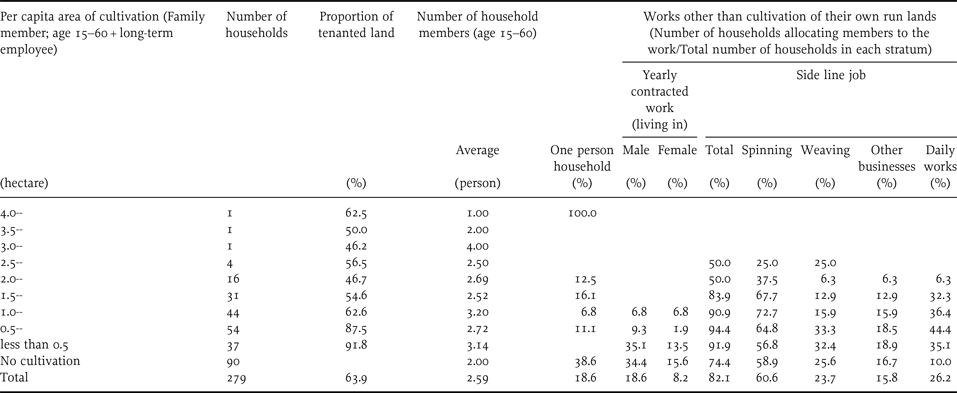 As was seen in the case of peasant-weavers, engaging in non-agricultural work as a sideline business is a straightforward illustration of the features of this strategic labour allocation behaviour. The flexible nature of this engagement in terms of working hours and the location was well suited to female workers in peasant households, who were indispensably engaged in multiple tasks, including housework. In other words, the deployment of a dispersed production system contributed to maintaining the workings of peasant households by delivering non-agricultural employment opportunities to households to utilize the slack time that was fragmented among its members and working hours.