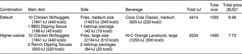 A higher-calorie version was constructed to reflect realistic consumer modifications such as add-ons to main dish and sides (e.g. mayonnaise or dipping sauces) or portion-size changes to any meal component (e.g. upsizing from medium to large fries). When creating the higher-calorie version, the base main dish remained the same, except for the addition of dipping sauces/condiments and an increase in size, if applicable. For lunch/dinner combinations, the highest-calorie sugar-sweetened beverage in the largest available size was included with the meal. For breakfast combinations, an orange juice in the largest available size was included. For all meals, the highest-calorie side option was selected in its largest available size. If a dipping sauce or condiment was advertised to accompany the main dish or side, two of the highest-calorie dipping sauces or condiments were included with each main dish and each side. To ensure consistency in constructing combination meal versions across restaurants, a codebook of rules was developed (see online supplementary material, Supplemental Fig. S2 and Supplemental Tables S2 and S3). Table 1 illustrates the creation of default and higher-calorie versions of a Chicken McNuggets combination meal from McDonald’s. A total of 360 combination meals were identified (180 default and 180 higher-calorie), comprised of 258 lunch/dinner meals, sixty-eight breakfast meals and thirty-four children’s meals.