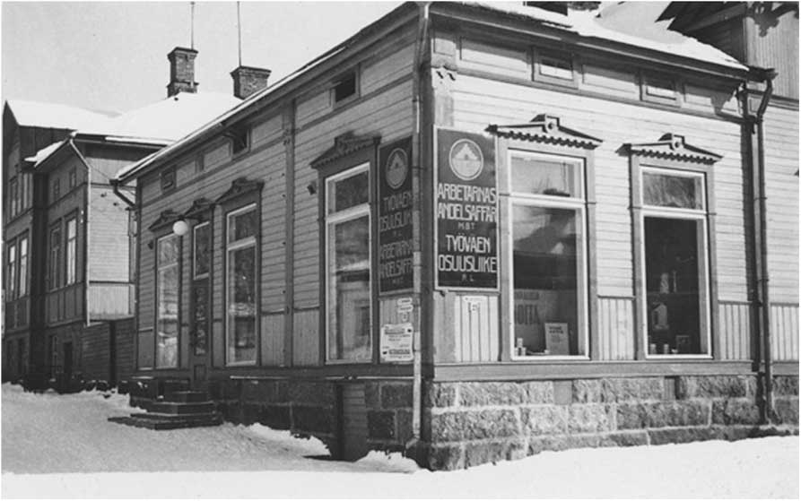 Figure 1 Local cooperative store of the Vaasa Region Cooperative Society, Finland, 1930. In 1916 the Finnish consumer cooperative movement split into two factions, each with its own wholesale society. Although the sign on this store says it is the “Workers’ Cooperative Store”, both sides of the movement remained politically unaligned. Finnish Labour Archives, Helsinki. Used with permission.