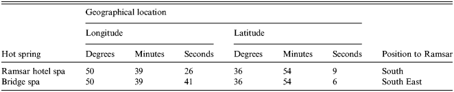 Table 1. Geographical location of two positive hot springs in northern Iran