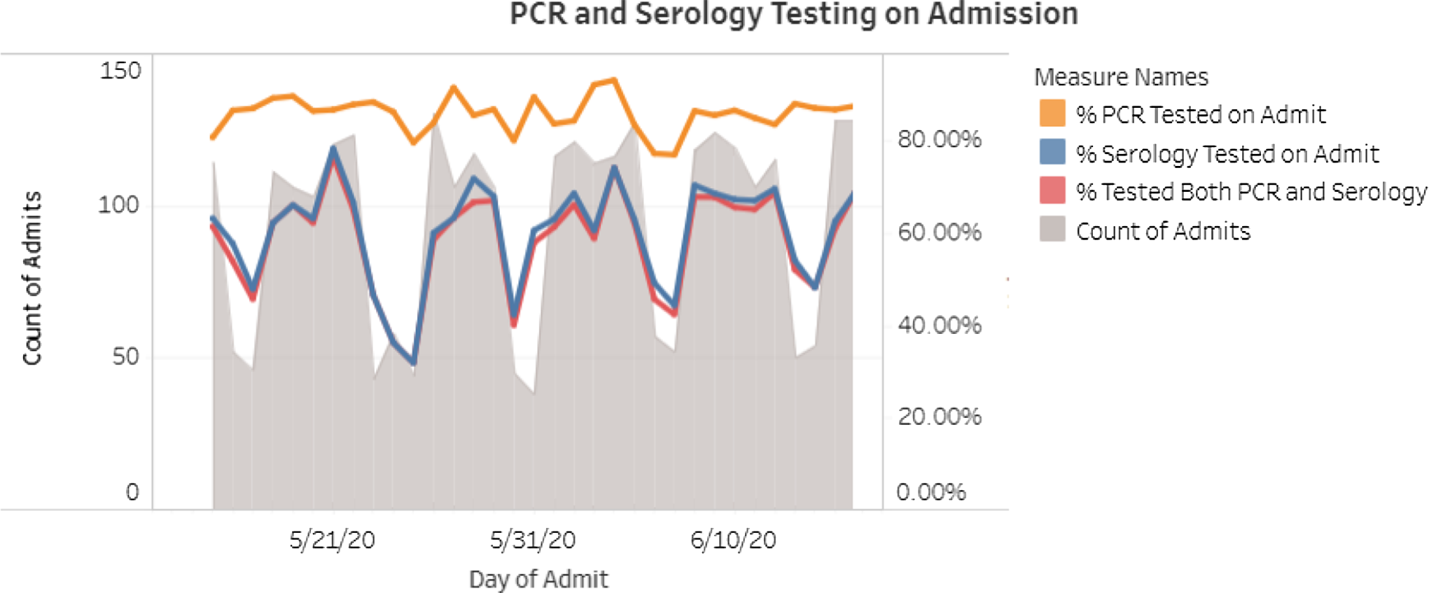 The admission PCR and serology tests were ordered by nursing staff using a protocol. Patients who tested positive were managed by the patient’s primary service in consultation with the COVID-19 treatment team. Patients who developed new fever or respiratory symptoms while in the hospital were tested by a repeat SARS-CoV-2 PCR at the discretion of the healthcare team. Admission testing rates were updated and reviewed daily through an internally facing dashboard (Fig. 2).