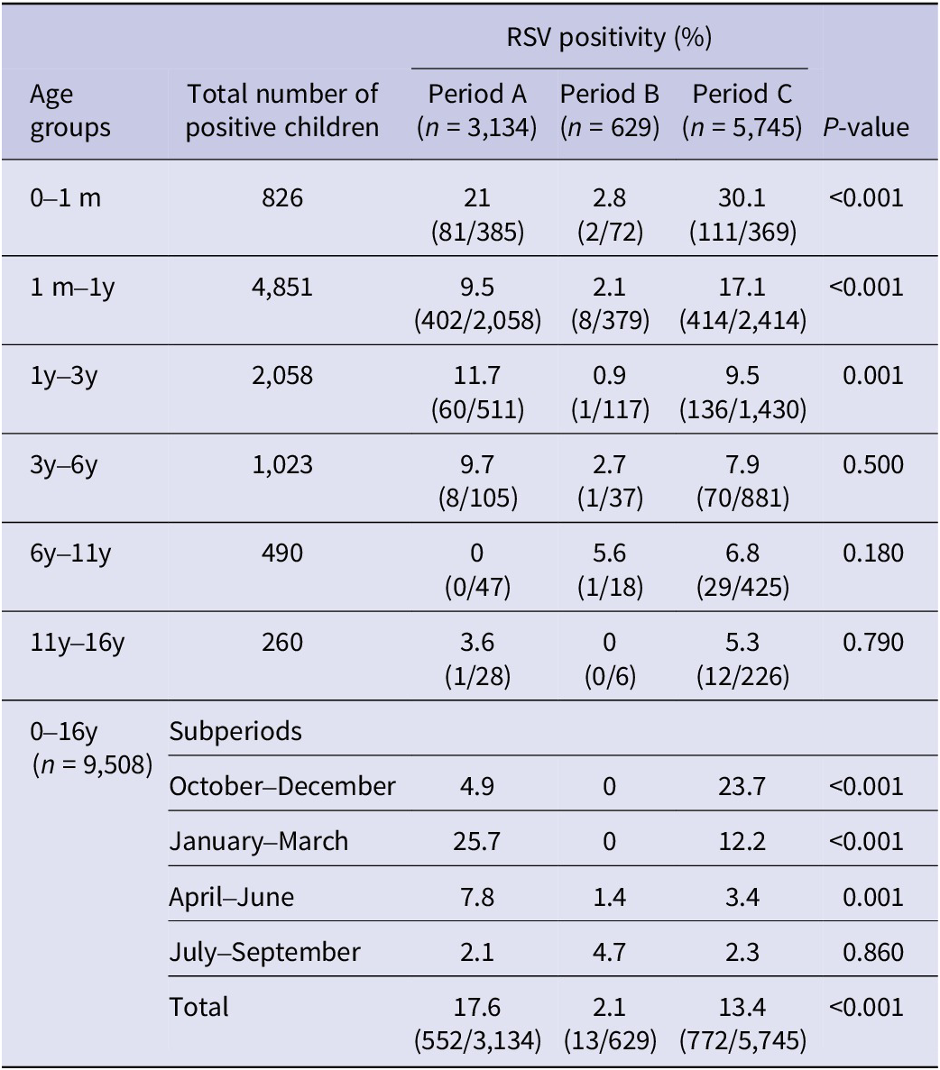 Table 1. RSV positivity (%) before (January 2018–February 2020, period A), during (March 2020–June 2021, period B), and after (July 2021–May 2023, period C) COVID-19 lockdown restrictions measures per subperiods within different age groups in hospitalized children