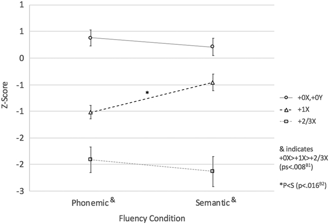 Fig. 3 Extra X versus Y Effects on Fluency Performance among Males. Note: +0X,+0Y > all groups on verbal fluency (collapsed across conditions); p<.008 (Bonferroni correction for 6 tests)