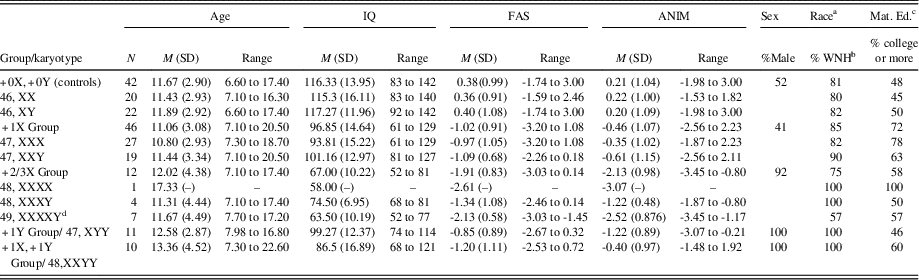 Table 1 Demographic information, IQ, and verbal fluency scores by study group and karyotype