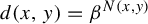 Moreover, given a real number $ \beta \in ({0,1}) $ , we define a compatible metric $ d $ on $ \Sigma _{A} $ by setting, for $ x,y \in \Sigma _{A} $ and $ x \neq y $ , $ d ({x,y}) = \beta ^{N ({x,y})} $ , where $ N ({x,y}) $ is the least integer $ N \in \mathbb {N} $ such that $ x_{i} \not = y_{i} $ . Furthermore, $ \min ({\varnothing }) := \infty $ by convention; in this case $d(x,y)=0$ .