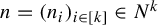 In the rest of the paper, we will use the following notational conventions. We denote by $ \mathbb {N} $ the semigroup of natural integers $ \{ 0,1,2,\ldots \} $ and by $ \mathbb {N}_{>0} $ the set of positive elements of $\mathbb {N}$ . For fixed $ k \in \mathbb {N}_{>0} $ , we denote by $\mathbb {N}^k$ the semigroup of all ordered k-tuples of elements of $\mathbb {N}$ and by $ [ k ] $ the set $[ k ]=\{ 1,\ldots ,k \} $ . We define the length $\lvert n \rvert $ of an element $n=(n_1,\ldots, n_k) \in \mathbb {N}^k$ by $\lvert n \rvert := n_{1} + \cdots + n_{k} $ .
