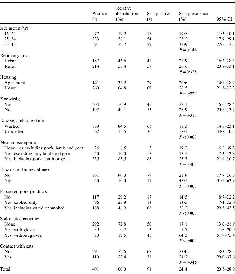 Antibodies (IgG and IgM) to T. gondii were found in 98 (24·4%) of 401 women (Table 1). Of the seropositive women, 92 (93·9%, age range 19–45 years) had only IgG antibodies; two (2%) women aged 28 and 32 years had only IgM; and four (4·1%) women (age range 24–35 years) had both IgG and IgM. Seroprevalence results for the three established age groups as well as for other independent variables are given in Table 1.
