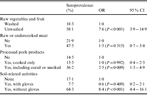 Risk factors for T. gondii infection in decreasing order were: soil-related activities without gloves (OR 8·4), consumption of unwashed raw vegetables or fruit (OR 7·6) and eating smoked or cured processed pork products (OR 2·5) (Table 2). Consumption of raw or undercooked meat was not identified as a risk factor.
