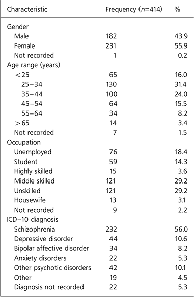 Table 1 reveals their socio-demographic characteristics and psychiatric diagnosis. The consulting doctors, as reflected in the table, did not record some of the information. When the patients were divided into two groups based on their age (<25 years and >25 years) it was found that the females were significantly older than the males (χ2=11.579; d.f.=1; P=0.001). The mean age for females was 40.19 (s.d.=13.27) and that for males was 34.07 (s.d.=12.46). Most of the patients (56%) who attended the clinic during this period had a diagnosis of schizophrenia. The ‘other’ category included patients with somatoform disorders, organic mental disorders and epilepsy.