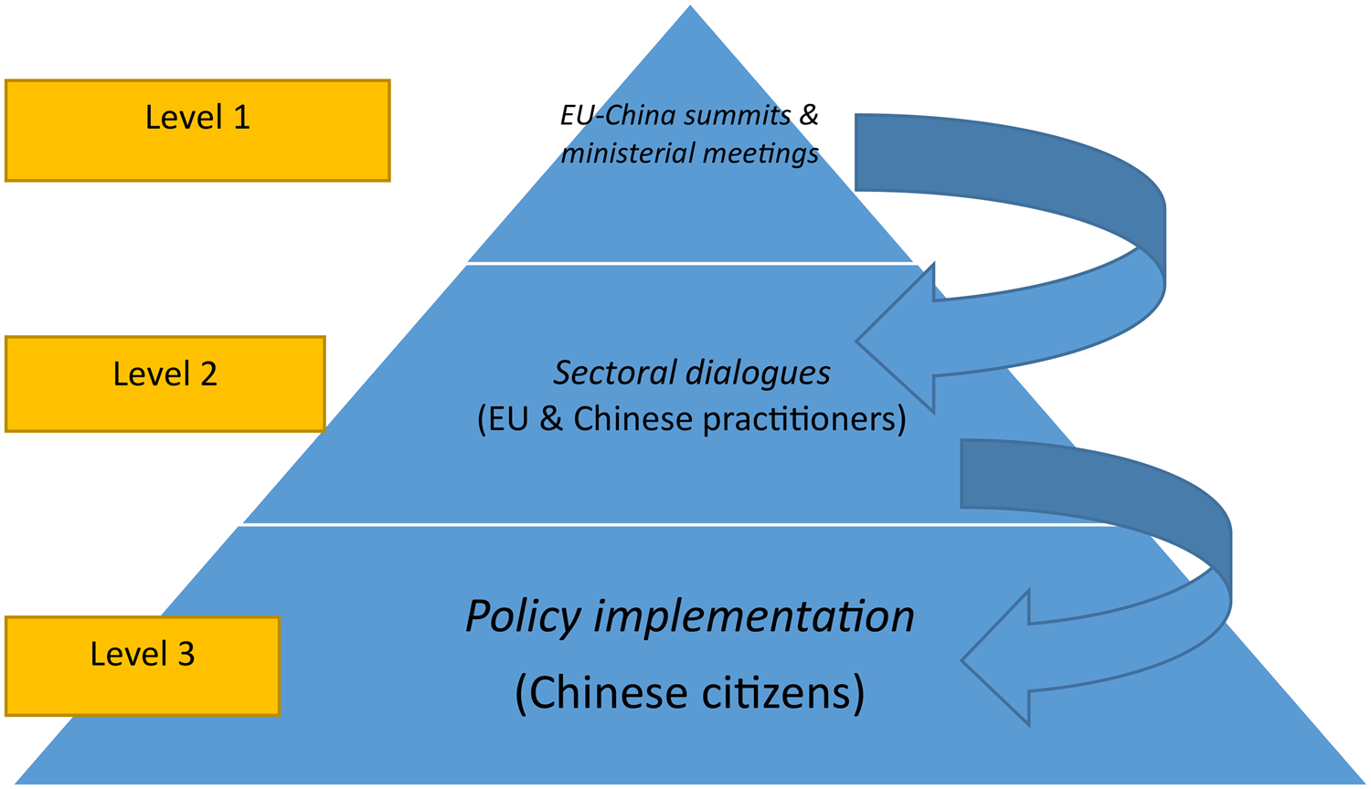 The hierarchical pyramid in Figure 1 depicts how governmental power flows (arrows in the scheme) from the higher echelons of Sino-EUropean leadership to Chinese citizens. Levels 1 and 2 consist of the governance practices that frame the institutionalisation of cooperation. Level 3 corresponds to the materialised policy outcomes (that is, policy implementation), also conceptualised here as governance practices. According to a post-liberal rationality, technologies of knowledge related to expertise facilitate technologies of power concerned with regulation and management. Whether governmental power flows from Levels 1 to 2 or from Levels 2 to 3, on the one hand a political mentality of linking expertise with efficient management of the population becomes evident and on the other, a tendency to construct self-serving and yet obedient political subjects among the Chinese population is observable. While in Lawrence's account of governmentality in EU governance we have a market rationality coexisting with a rights rationality, in the post-liberal governmentalised Sino-EUropean cooperation we see an effectiveness rationality resulting from apolitical, technologised expertise standing beyond existing liberal concerns.Footnote 48