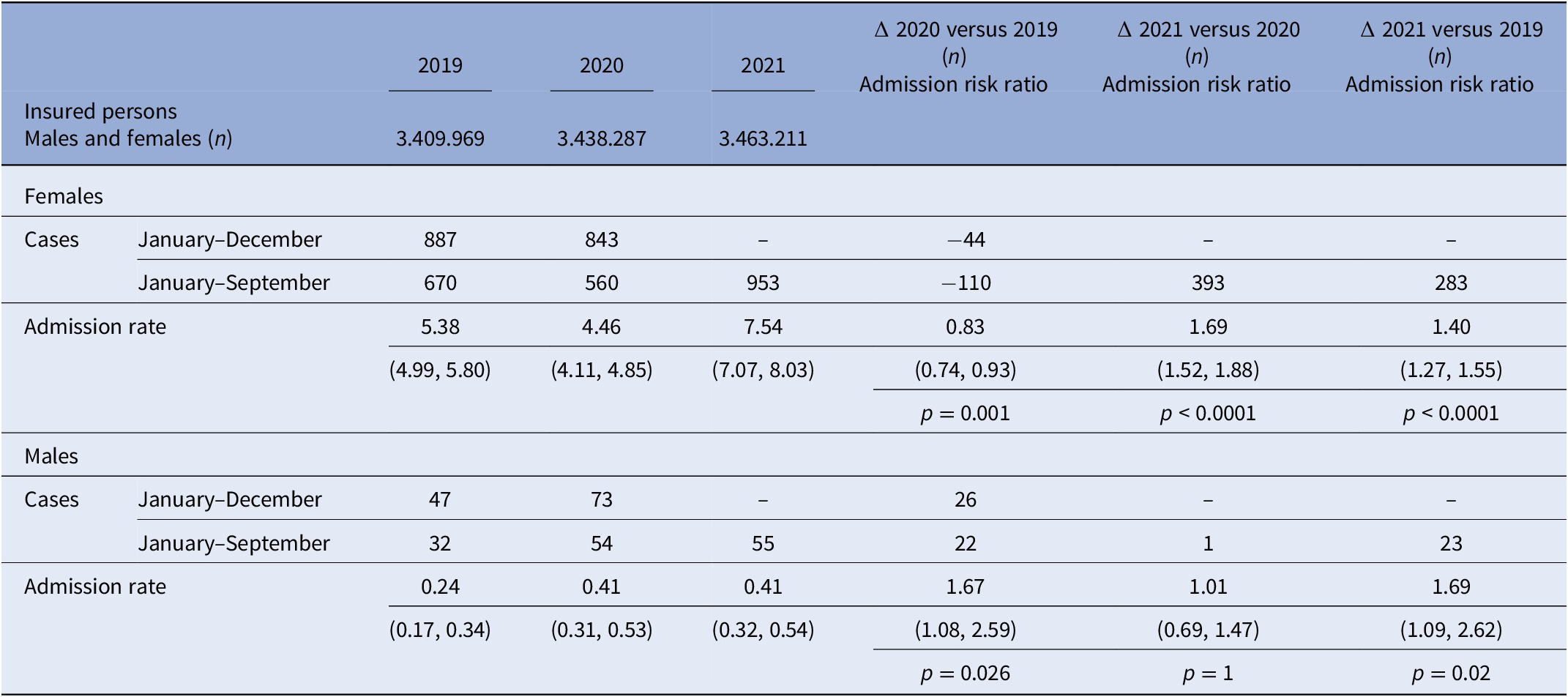Admission rates per 10,000 person-years were calculated separately by sex and age group, based on hospital admission numbers from the 9-month interval of January to September of each year (as available for all 3 years) and the number of insured persons (per sex and age group) of each year. Cases were only counted once, for example, a transfer from a general hospital to a psychiatric or psychosomatic hospital and vice versa was not taken into account for the statistical analysis. According to recent German census data, 51.32% of the population in the age group of 0–19 years was male. The 95% confidence intervals for admission rates were based on Wilson’s approximation [Reference Brown, Cai and DasGupta18, Reference Wilson19]. Admission risk ratios for comparing risks across years are also based on the January to September data and are presented with 95% confidence intervals and p-values from Chi-squared tests. Data analysis was performed by using the package epiR in R [Reference Stevenson and Sergeant20].