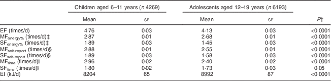 The strengths of the present study include the use of a variety of published definitions of MF and SF based on detailed dietary information obtained from two 24 h dietary recalls and the use of individualized measures of EER to assess misreporting of EI in a large representative sample of US children and adolescents. However, there are also several limitations. First, due to the cross-sectional design of the present study, the assessment of causality cannot be addressed. Considering the advice frequently made by individuals in the health-care professions and in the lay press that those who want to lose weight should eat small, frequent meals( Reference Hartline-Grafton, Rose and Johnson 25 , Reference Mattson 55 ), overweight and obese individuals may increase their MF and EF. Alternatively, overweight and obese individuals may simply decrease their MF, SF and EF in an attempt to lose weight. To minimize the potential effect, we included weight status as a potential confounding factor.