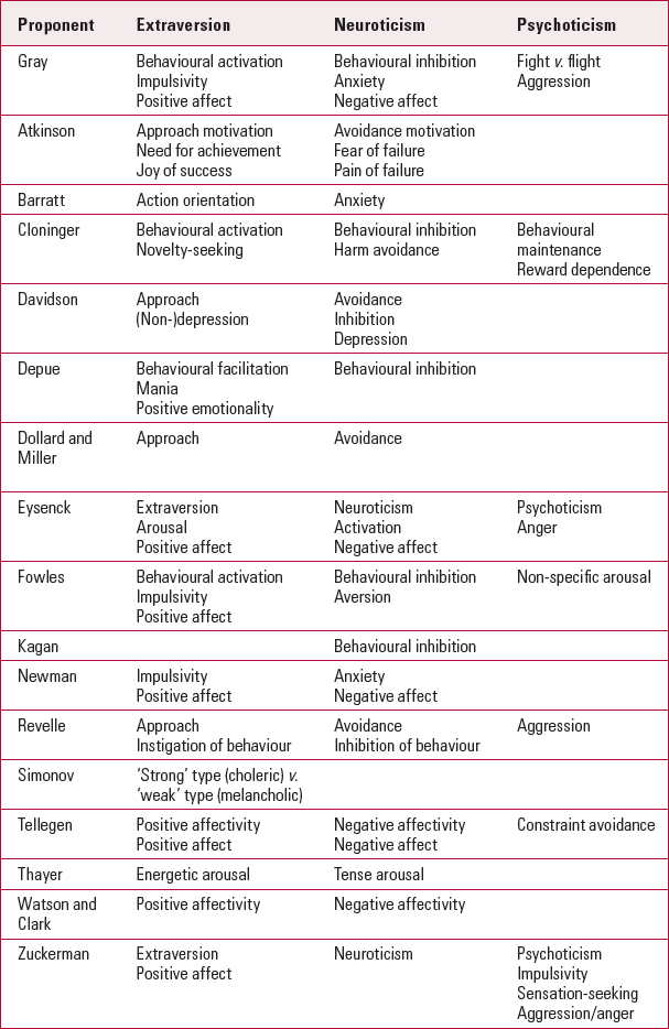 There is overwhelming empirical support for a dimensional representation of normal personality (Reference Widiger, Frances, Costa and WidigerWidiger 1994; Reference Clark, Livesley and MoreyClark 1997; Reference LivesleyLivesley 2007). Many dimensional or trait models of personality exist but most of these collapse into three (extraversion, neuroticism, psychoticism: Table 1), four (emotional dysregulation, dissocial behaviour, inhibitedness, compulsivity: discussed below) or five (neuroticism, extraversion, agreeableness, openness and conscientiousness) basic structures.