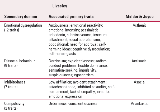 Proceeding from these general features of personality to the two lower levels in the hierarchy, Livesley commences his discussion of secondary domains by drawing attention to one of the most robust findings in the field of personality disorder. That is, when individual personality traits are subjected to factor analysis, four domains invariably emerge, so that ‘the robustness of the 4 factor model across clinical and nonclinical samples, cultures, and measurement instruments suggests that it reflects the biological organisation of personality’ (Reference Livesley, Jang and VernonLivesley 1998). This is where ‘nature is carved at its joints’, as these four domains of phenotypes are closely correlated to four genetic factors. Indeed, Livesley defines a secondary domain as ‘a cluster of traits influenced by the same general genetic factor’ (Reference LivesleyLivesley 2007). Livesley labels these four domains emotional dysregulation, dissocial behaviour, inhibitedness and compulsivity (Table 2). These dimensions correspond to Reference Mulder and JoyceMulder & Joyce's (1997) nomenclature of the four ‘As’ of personality: asthenic, antisocial, asocial and anankastic.