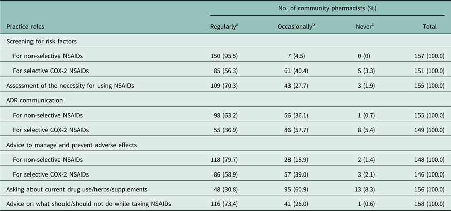 The frequency of community pharmacists’ self-reported practice roles in supplying NSAIDs are illustrated in Table 2. Almost all claimed to regularly or occasionally determine the need for an NSAID and explain to patients what they should or should not do while using NSAIDs. Less than a third claimed to seek information about concomitant drugs and supplements on a regular basis. While all claimed to screen patients for risk factors before supplying non-selective NSAIDs, the proportion indicating doing so was slightly lower for supply of selective COX-2 NSAIDs (n=146, 96.7%).
