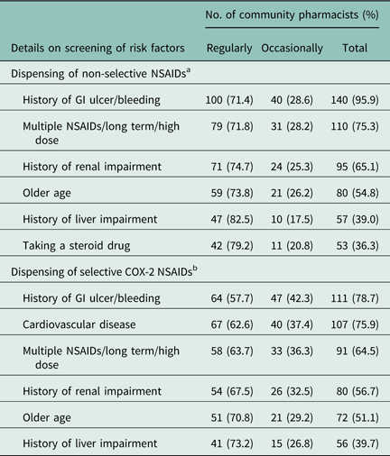 Similarly, fewer indicated that they regularly communicated about ADR and provided advice on managing and preventing adverse effects of selective NSAIDs compared with non-selective NSAIDs. Details of the screening which community pharmacists claimed to perform before dispensing are presented in Table 3, which differed slightly between the two classes of NSAID. In univariate analysis, no significant factor was related to screening practices for NSAID risks.