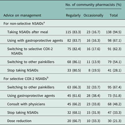 Differences in reported provision of information regarding potential ADRs and how to prevent or manage them were also found for the different classes of NSAID. For non-selective NSAIDs, pharmacists claimed to provide information most frequently about GI ulcer (n=144, 95.4%) and GI bleeding (n=97, 64.2%), but for selective NSAIDs, the most common ADRs mentioned were CV events (n=100, 74.1%), with other potential ADRs being mentioned by fewer than half, including high blood pressure (n=48, 35.6%). For non-selective NSAIDs, pharmacists’ most common advice for preventing GI problems was to take after meals (n=138, 94.5%), but many also claimed they would advise patients to use gastroprotective agents (n=98, 67.1%), switch to selective NSAIDs (n=91, 62.3%), or use other painkillers (n=79, 54.1%). However, for selective NSAIDs, the most frequent advice given was to switch to other painkillers (n=95, 67.4%), use a gastroprotective agent (n=73, 51.8%), or see a doctor (n=68, 48.2%) (Table 4).