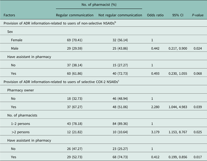 Multivariate analysis in Table 5 found that, for non-selective NSAIDs, male pharmacists were significantly less likely to inform patients about ADRs [odds ratio (OR) 0.44, 95% confidence intervals (CI) 0.217–0.900]. However, communication about potential ADRs for users of selective NSAIDs was higher in pharmacy owners (OR 2.28, 95% CI 1.044–4.983) and in pharmacies with more than two pharmacists (OR 3.18, 95% CI 1.153–8.767). In contrast, pharmacists who had assistants were significantly less likely to inform about ADRs to selective NSAID users (OR 0.41, 95% CI 0.199–0.856). However, there were no statistically significant factors which influenced the provision of ADR management to patients.
