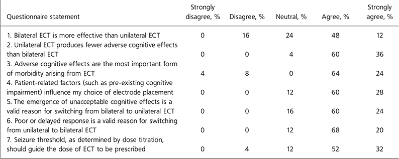 I conducted a postal survey by sending, once only, a questionnaire to the 375 consultant psychiatrists in Scotland, currently members of the Royal College of Psychiatrists. Ethical approval was obtained from the local research ethics committee in Glasgow. The questionnaire used a series of Likert scales to elicit attitudes and practices of Scottish consultant psychiatrists. The first question asked whether the person prescribed the ECT, and only those who did were asked further questions. They had to indicate whether they preferred bilateral, non-dominant unilateral or other electrode placement in most circumstances. They were then asked their opinion (strongly disagree, disagree, neutral, agree, strongly agree) on the seven statements concerned with various aspects of the two types of ECT (Tables 1 & 2). Finally, respondents were asked to indicate the minimum difference in effectiveness (in terms of improvement on Montgomery-Åsberg Depression Rating Scale (MADRS; www.crazymeds.us/MADRS.pdf), response rate and remission rate between the two treatments that they would consider clinically significant. The MADRS, rather than the Hamilton scale (which is more often used in antidepressant medication research) was chosen as it is used by the Scottish ECT Audit Network (www.sean.org.uk/AuditReport/Phase1) to measure response to ECT and so it was assumed that Scottish ECT prescribers would be familiar with it.