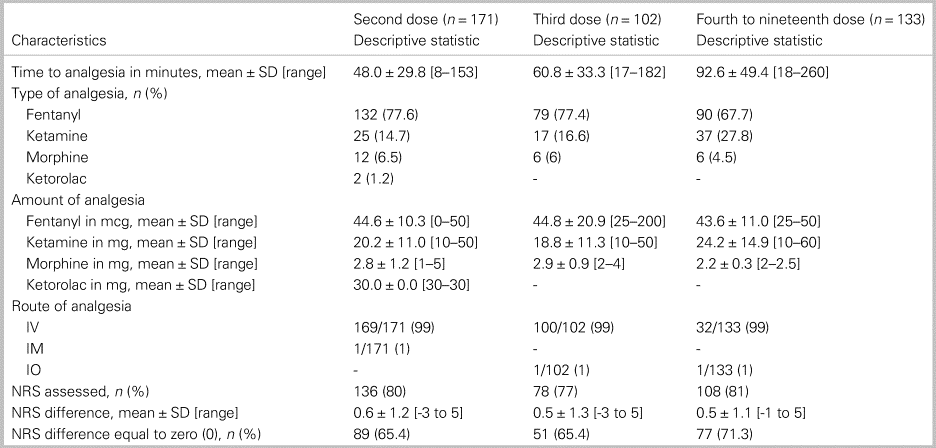 We used descriptive statistics to report results as mean ± standard deviation, range, and percentage. Pain management, analyzed according to absolute differences in numerical rating scale pain assessments following administration of analgesia medication, was reported as the mean numerical rating scale differences between doses and also the number of patients experiencing numerical rating scale differences equal to zero (i.e., no change in numerical rating scale pain assessment from baseline to first dose of analgesia; from first dose to second dose; from second dose to third dose etc.).