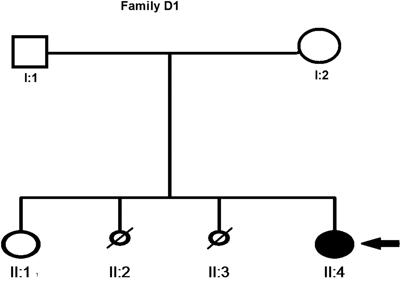 Fig. 1. Pedigree of family of patient D1. The small circles with diagonal lines represent the spontaneous abortion of female fetus while the filled circle shows the affected female.