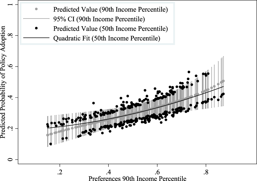 The thin black line in figure 6 represents the quadratic fit between the predicted values based on the preferences of the median income and the preferences of the ninetieth income percentile. This line offers a direct indication of the association between expected outcomes and relative policy support. The near identical correspondence between this line and the predicted values from the ninetieth income percentile (grey dots) means that even if policy only reflected the preferences of those in the middle, we would still expect the probability of policy change to increase as the support for the policy among the wealthy increased. Of course, the converse is also true. Figure A-1 in Supplementary Appendix 2 plots the probability of policy adoption as a function of the preferences of the fiftieth income percentile (instead of the ninetieth income percentile). When the predicted values are plotted in this way, we see that the probability of policy adoption also increases as support among those in the middle increases. This is exactly what we would expect if those in the middle receive substantial coincidental representation when their preferences differ from the wealthy.