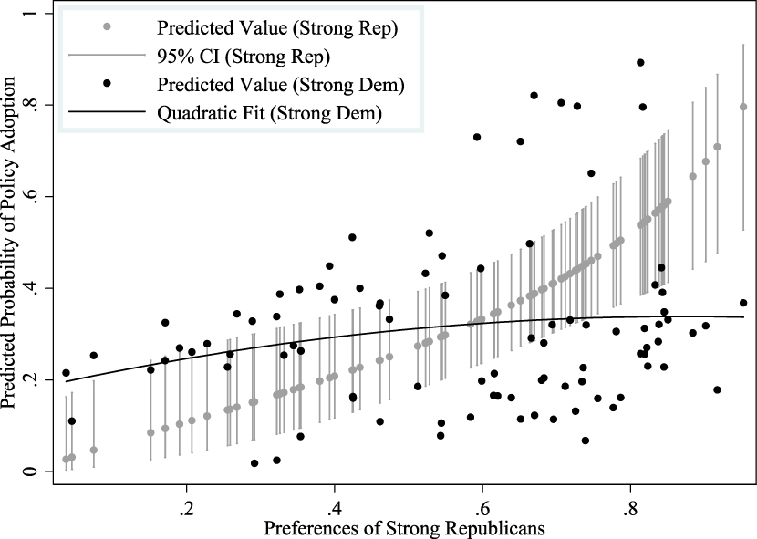 To evaluate whether Strong Democrats received coincidental representation, I examined the counterfactual scenario where Strong Democrats received the same Representation as Strong Republicans. The black dots in figure 7 indicate the expected probability of policy adoption based on this counterfactual scenario. Footnote 39 These predicted probabilities follow a much different pattern than what we observed for middle-income individuals in figure 6. First, the predicted values for Strong Democrats are much more dispersed. In fact, 76 percent are outside the 95 percent confidence intervals based on Strong Republicans. Not only is this more than twice as many as for the middle-income respondents, but the proportion of policies where preferences differ by more than 10 percentage points is also much greater for strong partisans than for middle- and high-income groups (72 percent versus 18 percent). Thus, these values outside the confidence intervals represent 55 percent of all policies in the strong partisan analysis while the values outside of the 95 percent confidence intervals for middle-income respondents represented just six percent of all observations. These patterns suggest that if policy during the early 2000s followed the preferences of Strong Democrats instead of Strong Republicans, policy would have looked much different. The flat trajectory of the thin black line, which reflects the quadratic fit between the predicted probability of policy adoption for Strong Democrats (if they received the same representation as Strong Republicans), reinforces this conclusion. This flat relationship means that as support for a policy among Strong Republicans increases, we have no evidence that the probability of policy adoption would also increase if policy reflected the preferences of Strong Democrats. Coincidental representation is minimal (at best) for strong partisans.