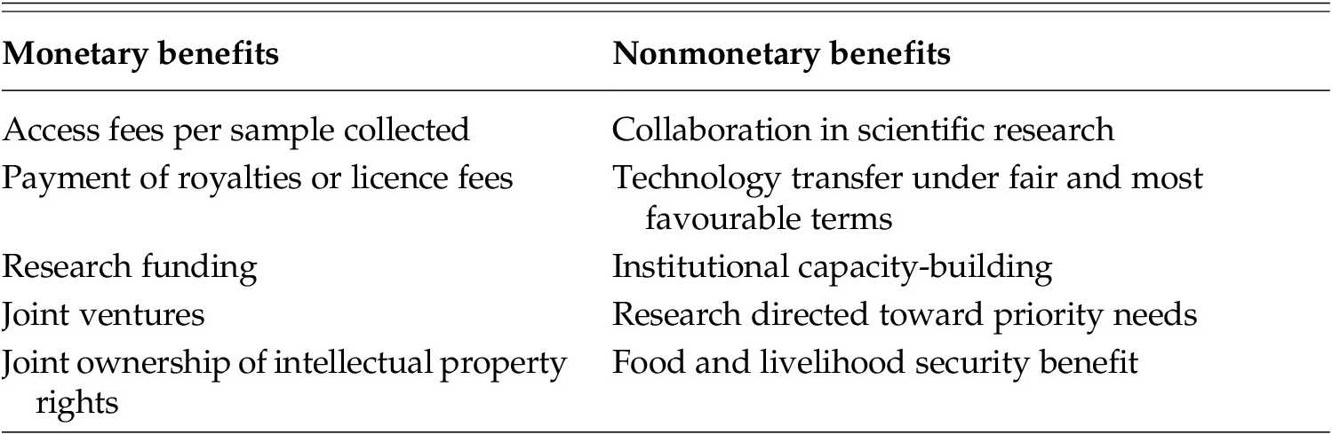 Whilst the Nagoya ProtocolFootnote 31 provides sample benefits (see Table 2), other benefits can be agreed.