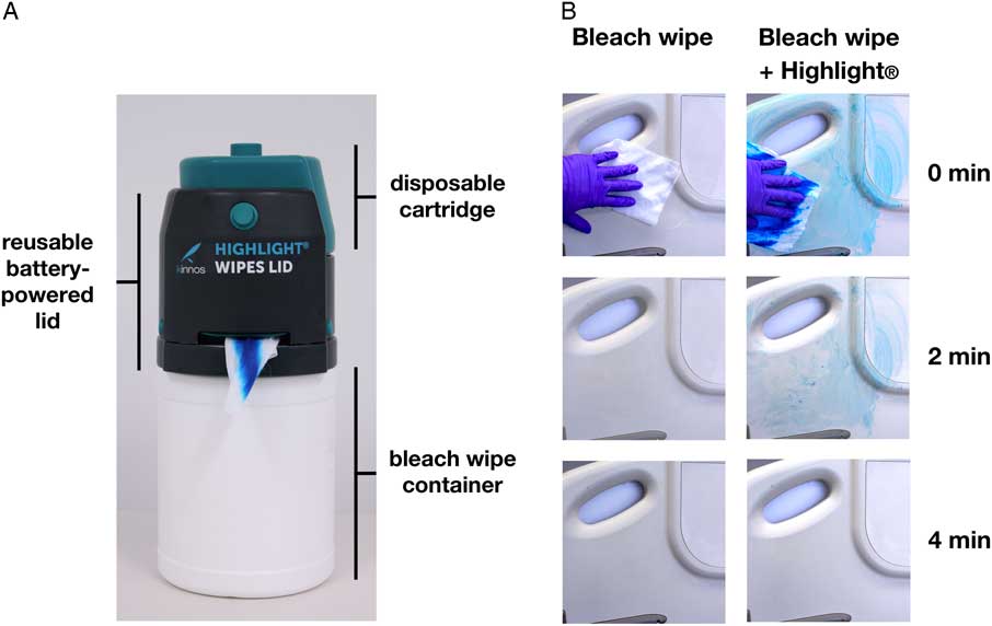 A novel attachment to bleach wipe containers, the Highlight Wipes Lid (Kinnos, Brooklyn, NY) administers a blue indicator onto dispensed bleach wipes to provide real-time visual feedback of the thoroughness of surface coverage and the passage of contact time.Reference Tyan, Jin and Kang 7 As shown in Fig. 1A, the device consists of (1) a reusable lid that attaches onto standard containers of commercially available bleach wipes, and (2) a disposable cartridge containing the Highlight blue liquid additive and pre-installed batteries. A user presses the button to dispense individual wipes imbued with the blue indicator through the front face of the battery-powered lid. This dispensing mechanism was designed for ease of use and prevention of bleach splash-back that typically occurs when manually pulling wipes through standard lid orifices. Furthermore, the lid automatically retracts hanging wipes back into the canister after a period of inactivity to prevent drying of the bleach wipe, loss of efficacy, and wastage of the product—problems common in currently used bleach wipes.