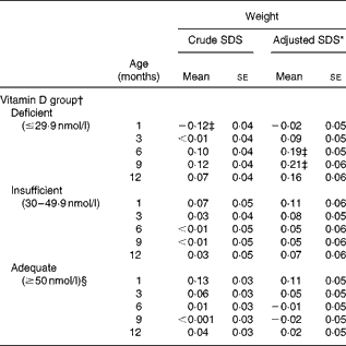 Table 3 Mean weight standard deviation scores (SDS) for the vitamin D categories at ages 1, 3, 6, 9 and 12 months