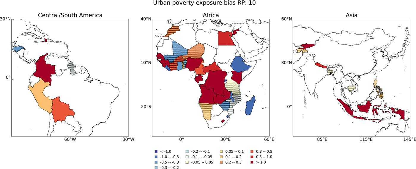Figure 3. PEB for 10-year return period floods, for urban households only. Note that the quintile subdivision used is based on urban households only. White areas are not part of the 52 country sample. Areas are dotted when there is a lower than 95% confidence that the sign of the exposure bias is as estimated.