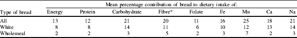 Median bread consumption was 90 (interquartile range 59–217) g/d, of which white and wholemeal bread contributed 65% and 17% respectively to total consumption. White and wholemeal bread were consumed by 90% and 37% of adults respectively. Consequently, despite having a lower content of several nutrients and fibre, the contribution of white bread to energy and nutrient intakes was substantially higher than that of wholemeal bread (Table). Bread made a disproportionately large contribution to the intakes of carbohydrate, fibre, Fe, Mn, Ca and Na relative to energy. Wholemeal bread provided more fibre and folate and less Na than white bread relative to energy contribution (Table).