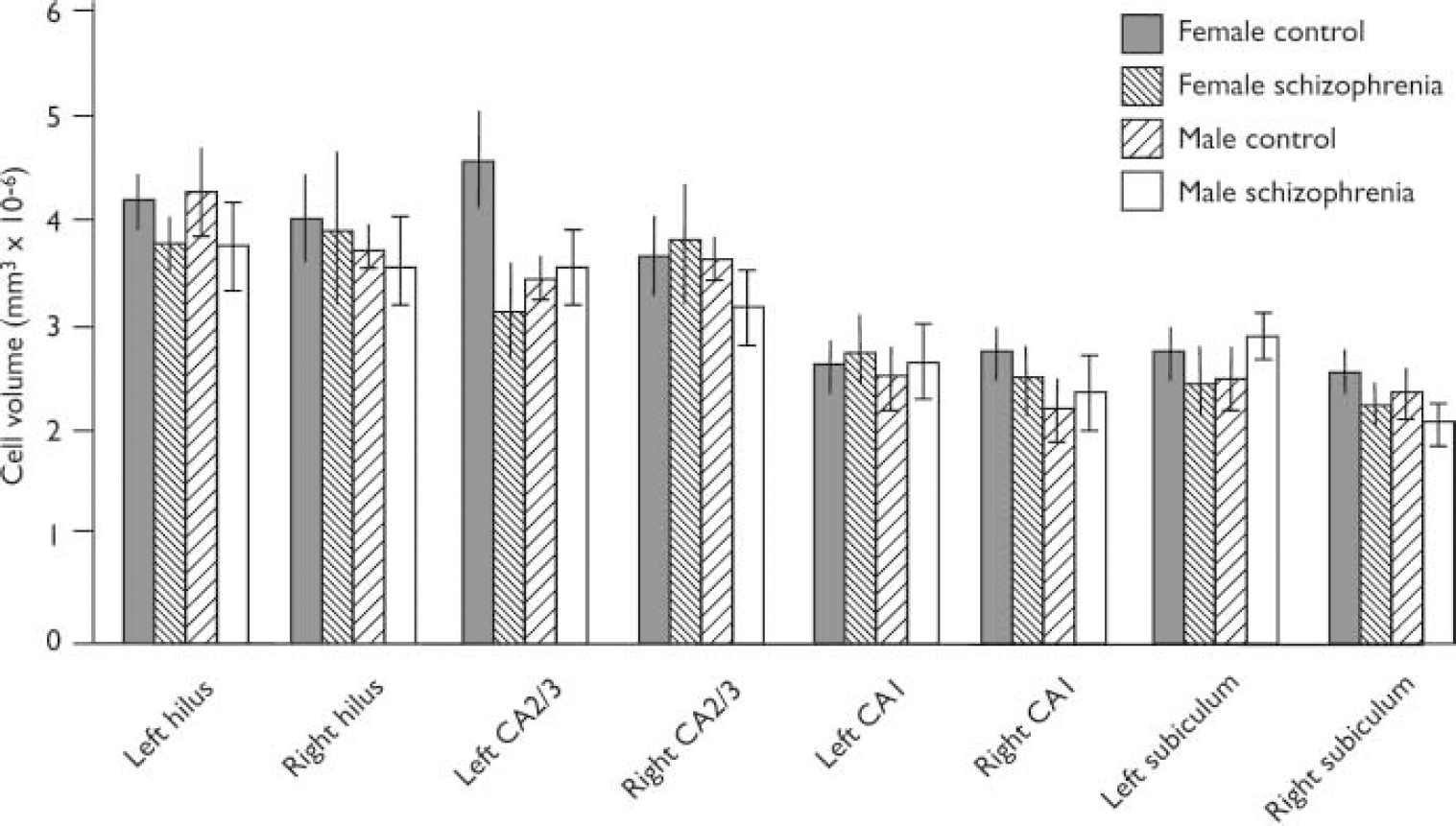 Fig. 2 Pyramidal cell volumes for hippocampal subregions (bars show means and standard error of the mean). Cases have been subdivided according to gender and disease category.