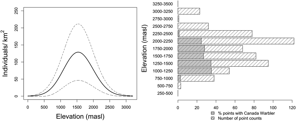 Figure 2. Relative density of Canada Warblers in forest peaked at intermediate elevations (around 1,500 m asl). A) Predicted densities across elevations obtained after averaging the four top models, two describing a quadratic and two a polynomial relationship with elevation. Dotted lines represent the standard error of predicted values (±SE). Predictions were made for mature forest in the Eastern Andes B) Percentage of points in mature forest at which Canada Warblers were detected by elevation band.