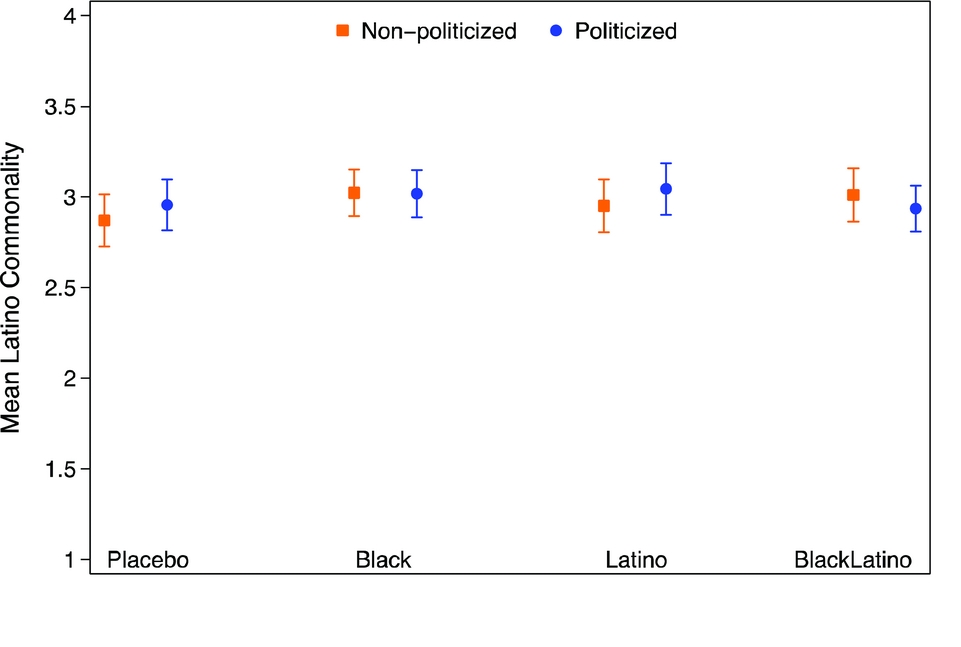 We uncover null effects. Despite strong cross-sectional findings, there is not an immediate causal relationship between shared social disadvantage and African Americans’ relatively high political commonality with Latinos. Rather, the causal link between social inequality and cross-racial political commonality is more contingent and limited than previous research suggests.